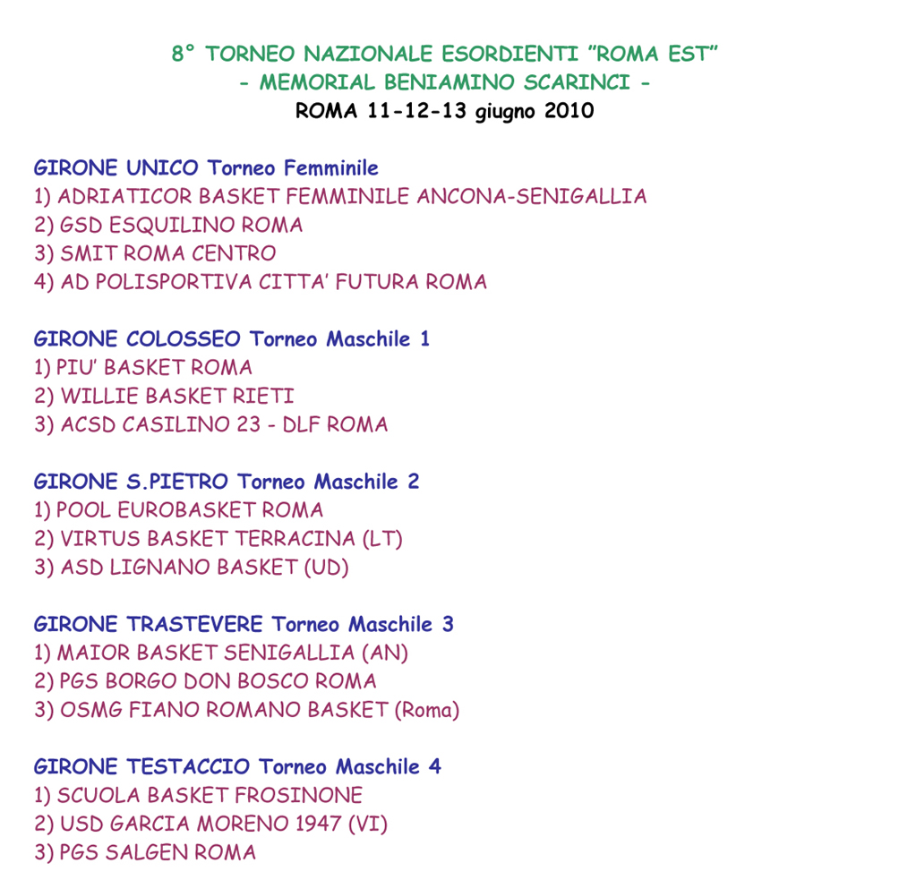 La Scuola Basket Frosinone vince l’VIII Torneo Roma Est "Memorial Beniamino Scarinci" per esordienti battendo (62-31) il Willie Basket Rieti, al terzo posto si classificano i ragazzi del Maior Senigallia che superano, nella finalina di consolazione, i pari età della Virtus Terracina 34-28.